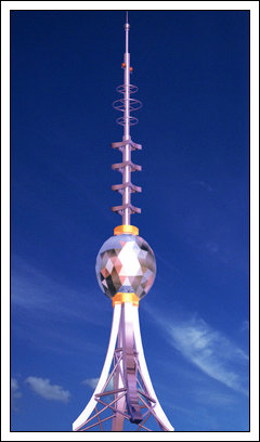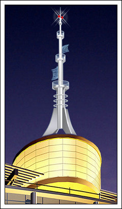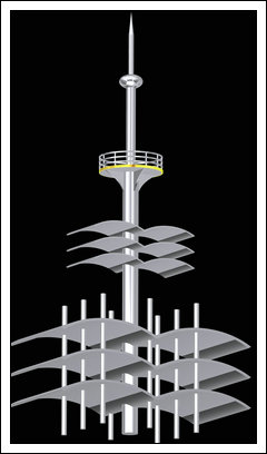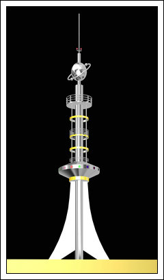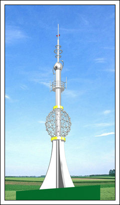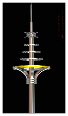 塔體的造型新穎別致,塔體外部包有不銹鋼板(或鈦金板),塔體上部安裝有各種不銹鋼環(huán),白天在陽光的照射下,閃閃發(fā)光,高貴無比,夜色降臨塔與LED燈光相映,更加使建筑物美倫美幻。