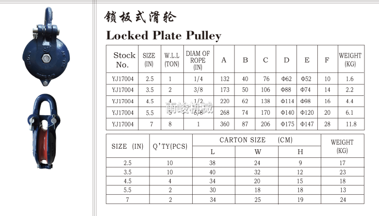 • 產(chǎn)品描述:該滑輪的拉力和尺寸均配合Snatch Block, 互相補充。表面處理為熱鍍鋅,電鍍鋅,噴塑等,均根據(jù)客戶要求。