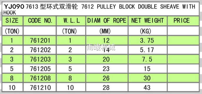 • 產(chǎn)品描述:該產(chǎn)品屬于起重鋼絲繩用滑輪,噸位從0.25T到20T,適用拉力范圍大,鋼絲繩徑從6MM到32MM,可以滿足大部分的起重需求。因為產(chǎn)品屬于非標(biāo)產(chǎn)品,所以安全系數(shù)小,破斷拉力是2倍,檔次比強(qiáng)力型的產(chǎn)品要低,所以使用過程一定注意不要超過安全拉力使用。