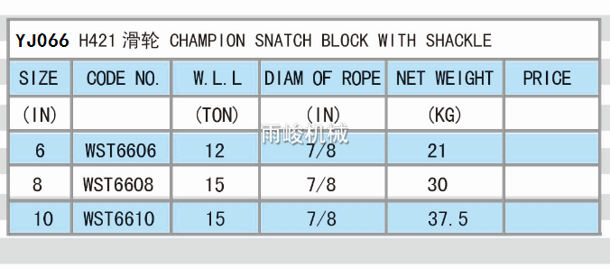 • 產品描述:該滑輪為美式重型鋼絲繩滑輪,為一個系列,該產品是其中最基礎的一款產品。主要銷售市場為美洲,中東,亞洲地區(qū),配鋼絲繩用。該款產品尺寸從3寸到18寸,拉力從2噸到15噸,鋼絲繩徑從3/8"到1寸,跨度比較大,可以滿足起重方面的大部分需求。