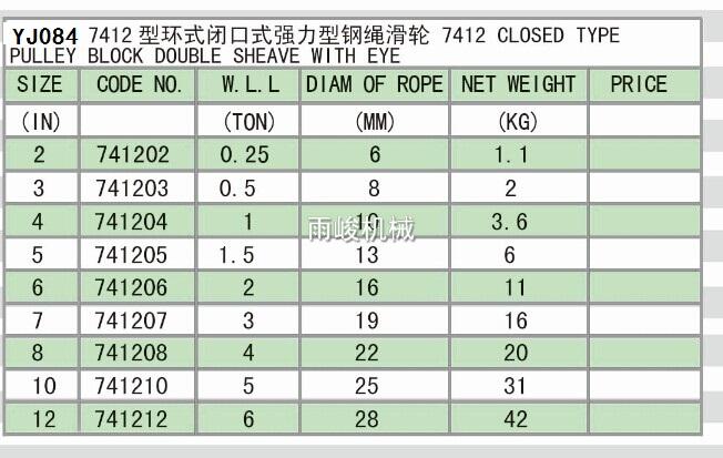 YJ084 7412 CLOSED TYPE PULLEY BLOCK DOUBLE SHEAVE WITH EYE