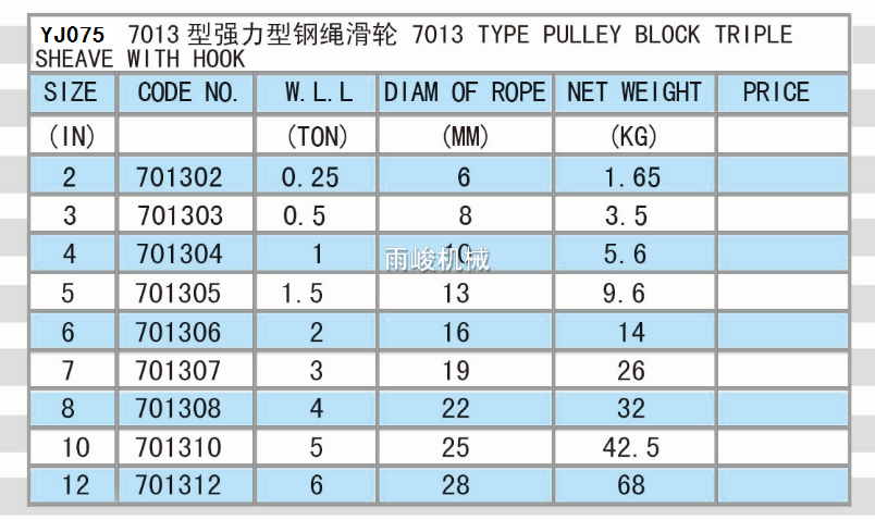 YJ075 7013 TYPE PULLEY BLOCK TRIPLE SHEAVE WITH HOOK