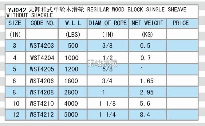 YJ042 REGULAR WOOD BLOCK SINGLE SHEAVE WITHOUT SHACKLE